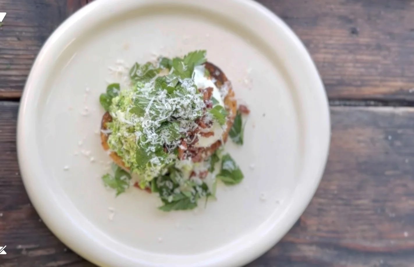 Tops with Pea ricotta smash, a poached egg, pancetta, picked herbs and a little grated parmesan.